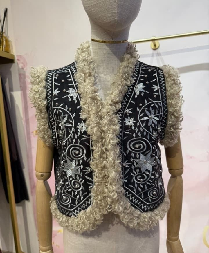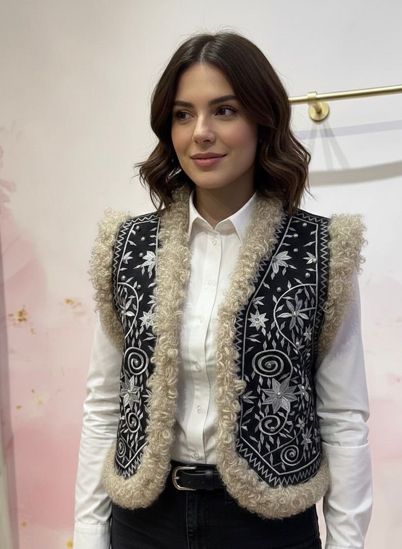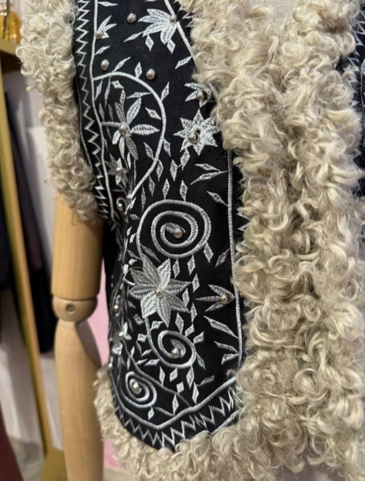 Chaleco con bordado en hilo gris etnico con ribeteado en el borde de PELO rizado ligeramente salpicado con pequeñas tachuelas plateadas.