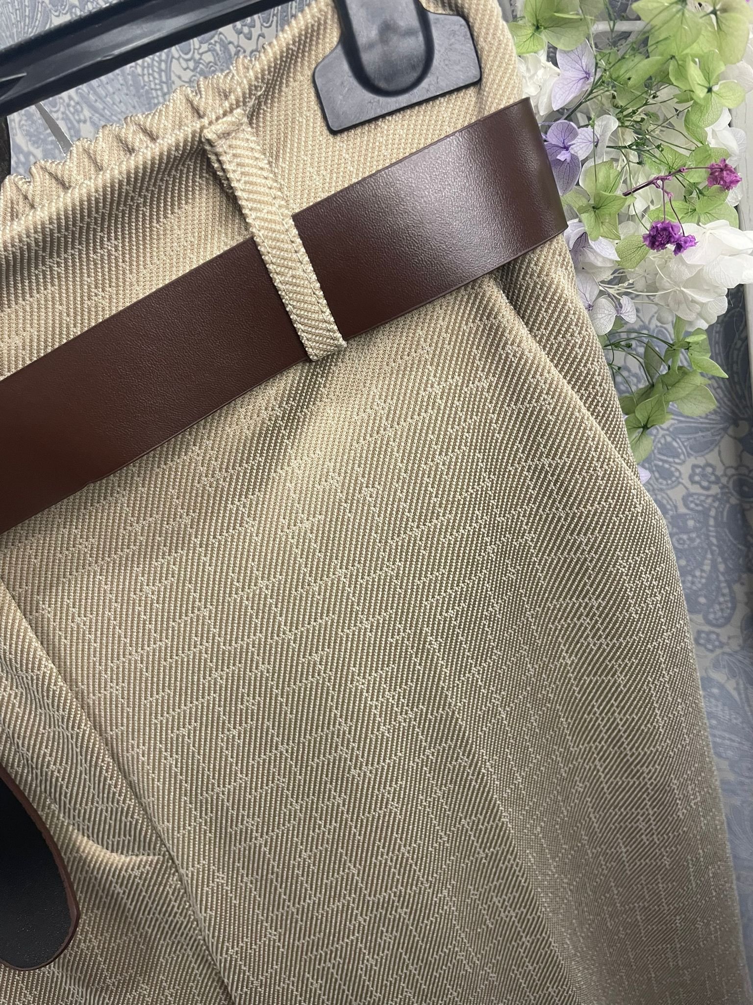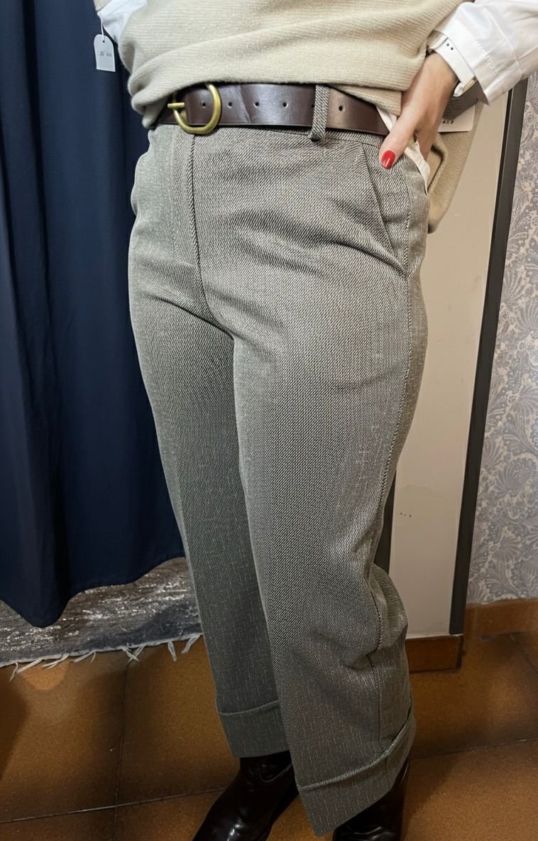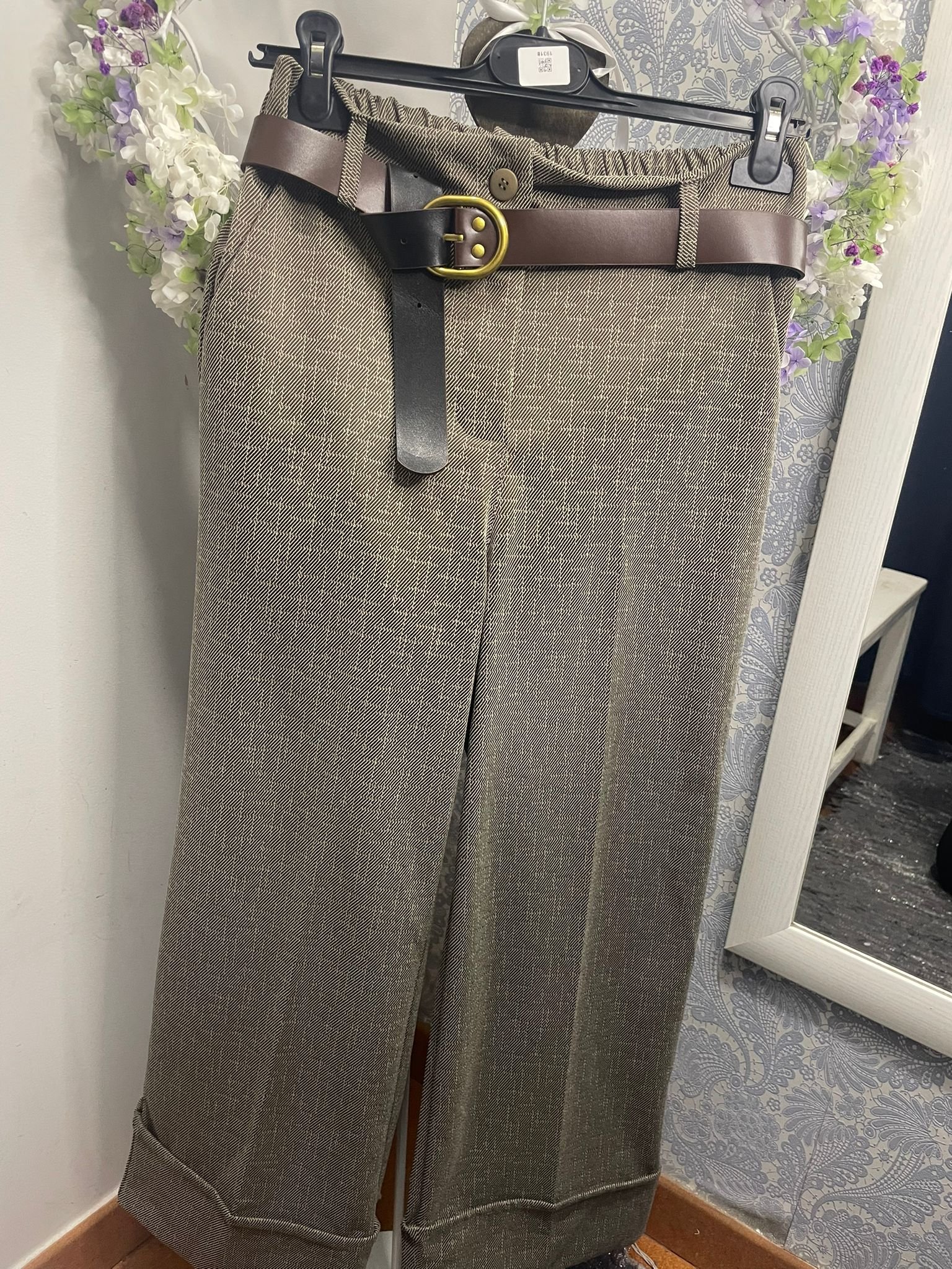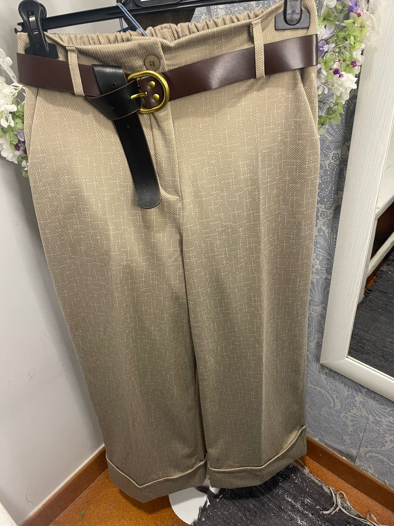 Pantalón ELASTICO de estampado picado en beige claro.  Pierna ancha y recta, el tobillo y el bajo terminan en dobladillo ancho. Cintura, con botón y goma trasera; medidas sin estirar.